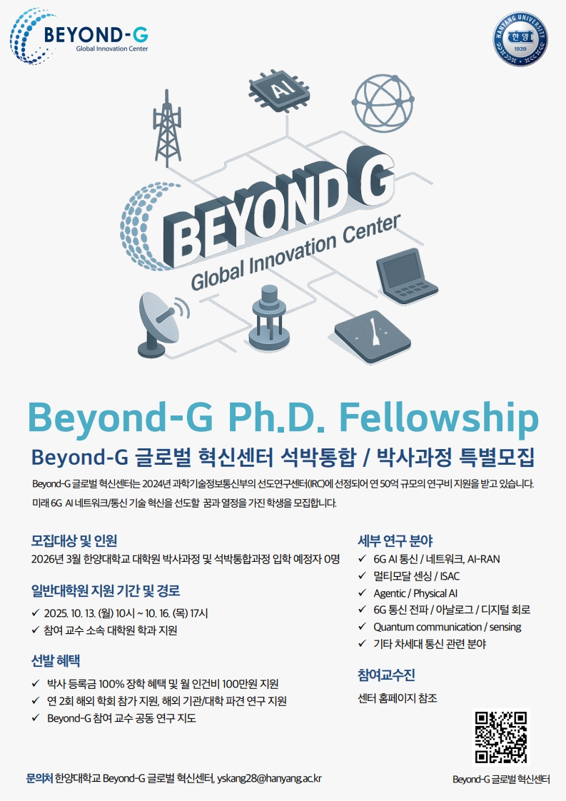 Beyond-G 글로벌 혁신센터는 2024년 과학기술정보통신부의 선도연구센터(IRC)에 선정되어 연 50억규모의 연구비 지원을 받고 있습니다.